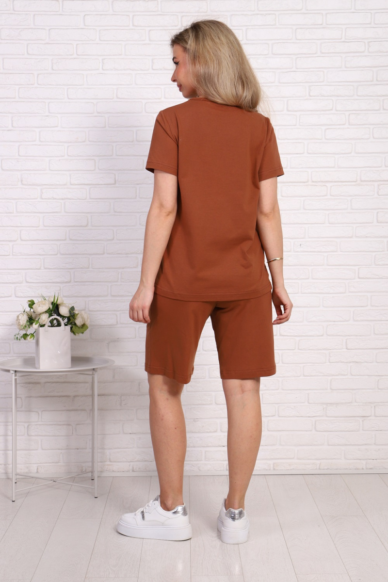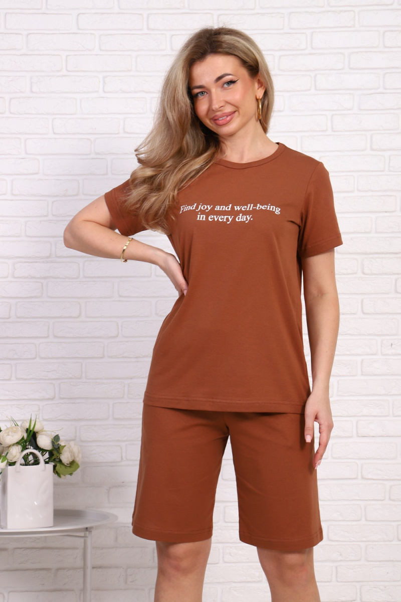 Костюм женский, лаконичный стиль: футболка прямого кроя, с короткими рукавами, с принтом в виде надписи на полочке и шорты на комфортном поясе, с удобными боковыми карманами.
