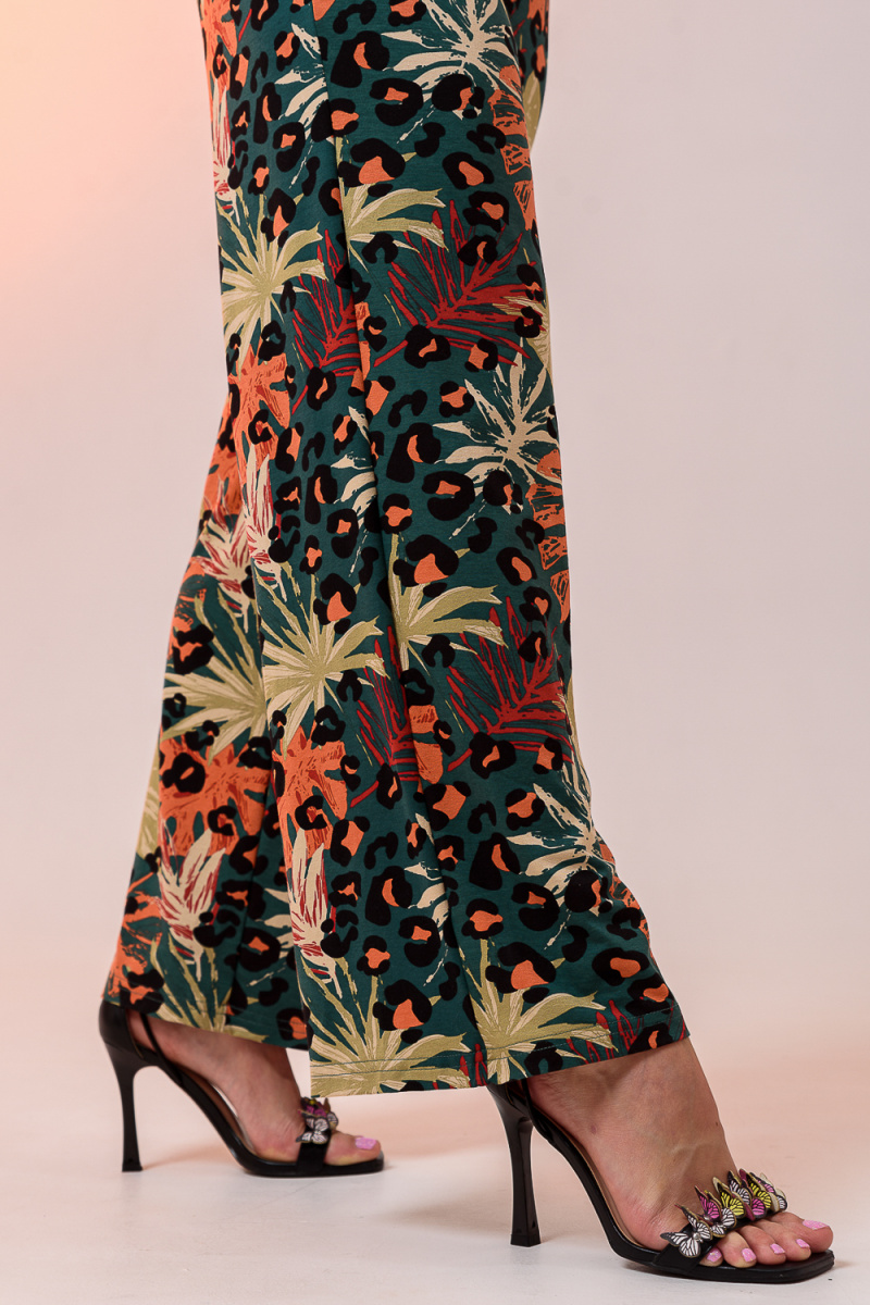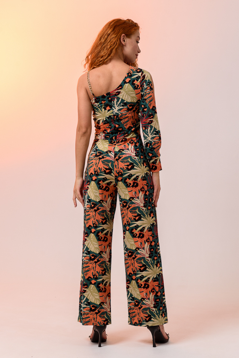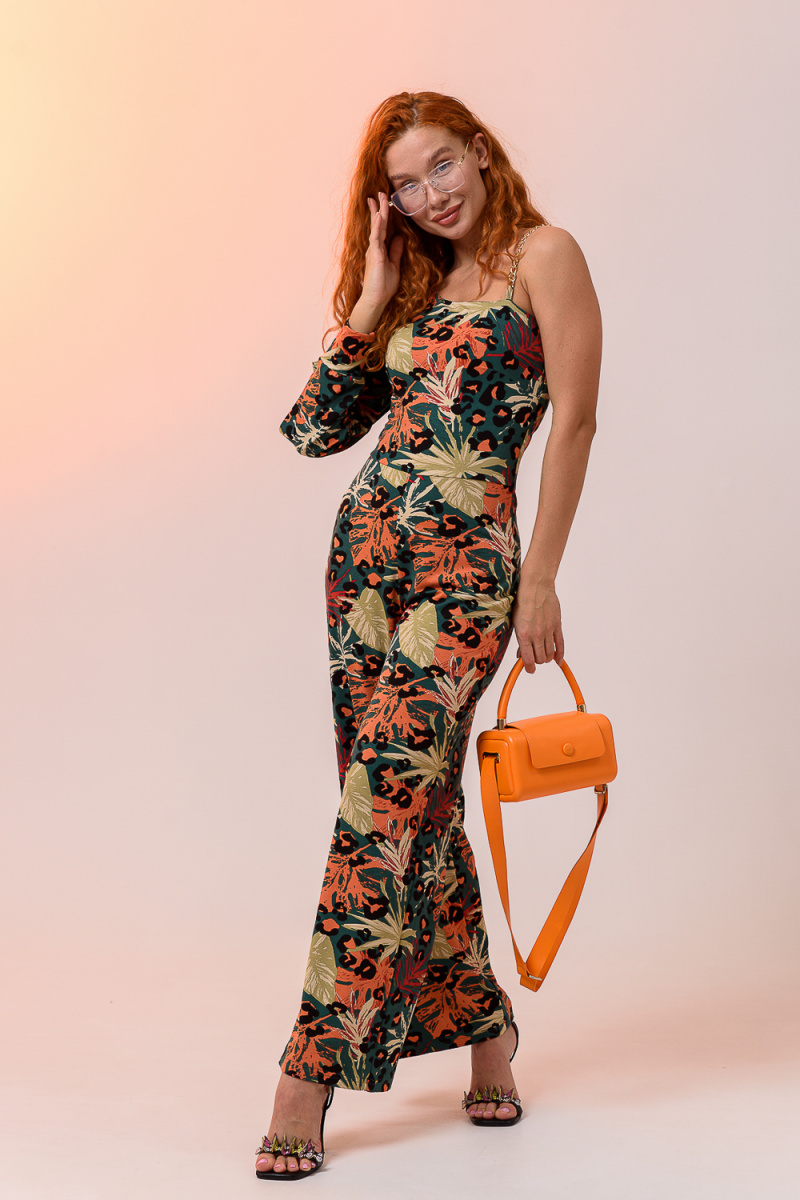 Стильный женский комбинезон с брюками палаццо открытым плечом на изящной цепочке и легким рукавом с разрезом. Выполнен из качественного материала хорошей растяжимости, не сковывает движения.