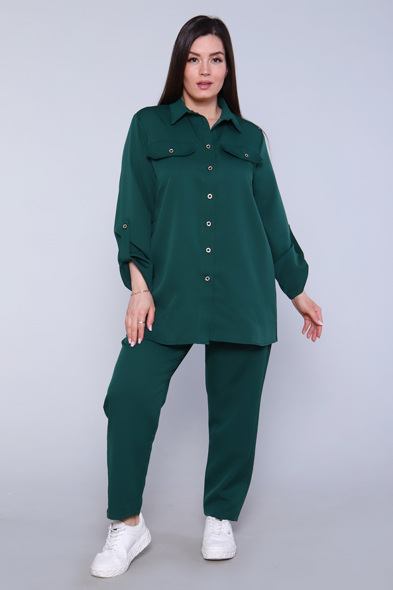 Женский костюм состоит из двух предметов, удобными однотонными брюками на резинке и однотонной туникой рубашечного покроя с двумя накладными нагрудными карманами. Такой костюм не стыдно будет надеть в гости, на работу или просто на вечернюю прогулку. Прекрасно сочетается как с туфлями, так и кроссовками.